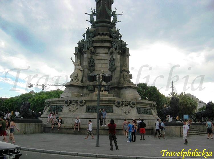 The Columbus Monument is a 60-meters tall monument to Christopher Columbus (left photo below). Located at lower end of La Rambla, it was constructed for the Exposición Universal de Barcelona in 1888 to honor Columbus first voyage to the Americas. Standing at 7.2-meters, the bronze status of Columbus is depicted to be pointing towards the New World with his right hand, while holding a scroll in the left (right photo below).